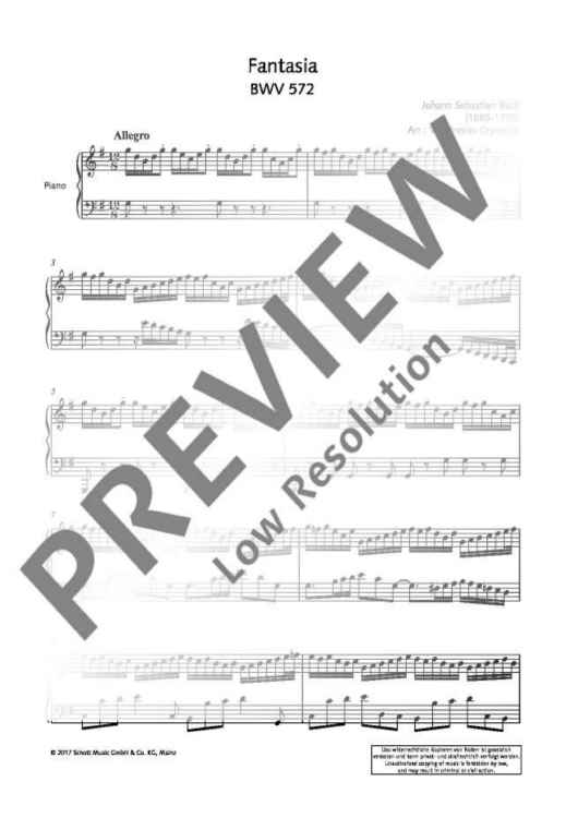 • for intermediate to advanced players • piano arrangement of the organ fantasia • Arranged by Vyacheslav Gryaznov This arrangement of Organ Fantasia BWV 572 for piano solo is an excellent addition to your piano library. Arranged by Vyacheslav Gryaznov for intermediate to advanced players, this high baroque piece in G major is characterized by fast moving semi-quavers.