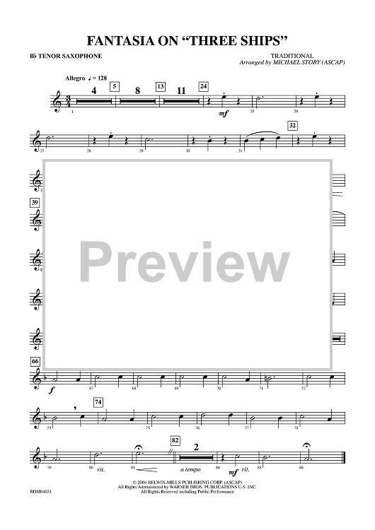Digital Sheet Music for Fantasia on "Three Ships" - Tenor Saxophone by Michael Story, Traditional scored for Concert Band; id:314766