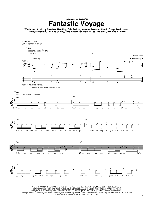 Digital Sheet Music for Fantastic Voyage by , Fred Alexander, Norman Beavers, Coolio, Marvin Craig, Brian Dobbs, Artis Ivey, Fred Lewis, Tiemeyer McCain, Thomas Shelby, Stephen Shockley, Otis Stokes, Mark Wood scored for Bass Tab; id:390128