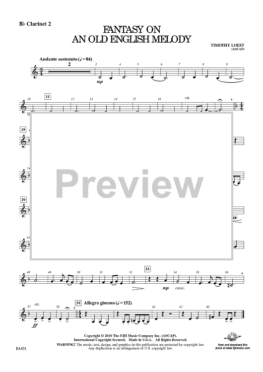 "Fantasy On An Old English Melody - Bb Clarinet 2" Sheet Music by Timothy Loest