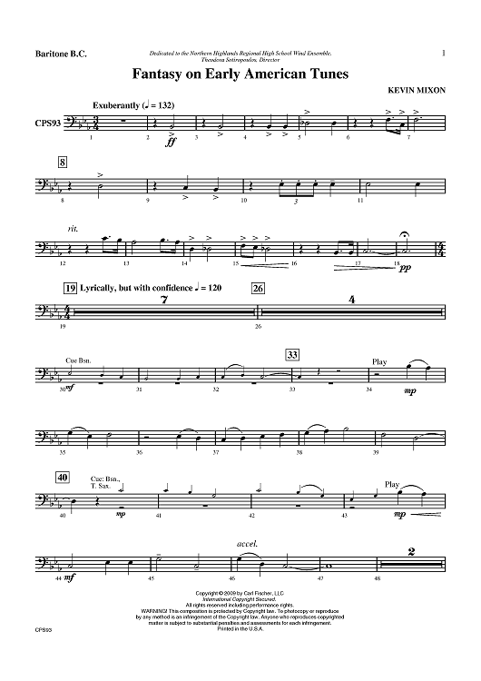 Digital Sheet Music for Fantasy on Early American Tunes - Baritone (Bass Clef) by Kevin Mixon scored for Concert Band; id:405781