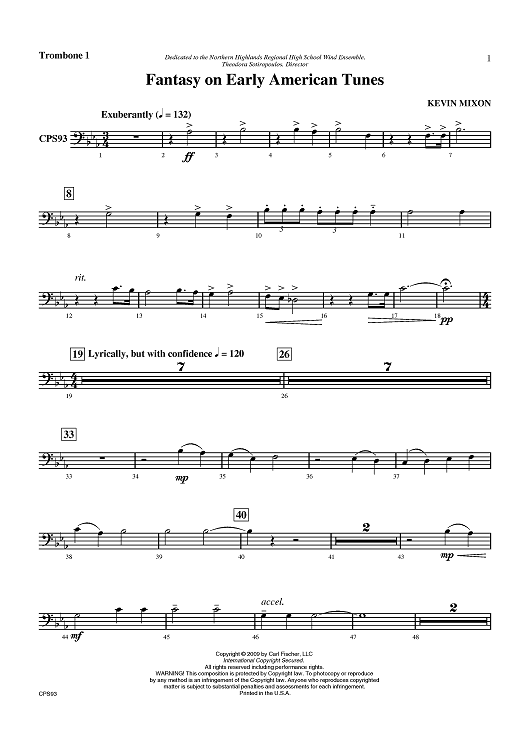 "Fantasy on Early American Tunes - Trombone 1" Sheet Music by Kevin Mixon