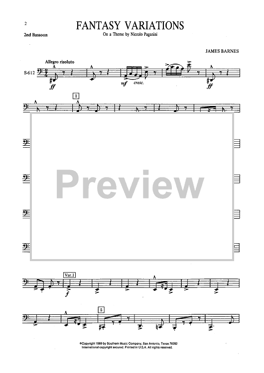 Digital Sheet Music for Fantasy Variations on a Theme of Paganini - Bassoon 2 by James Barnes scored for Concert Band; id:503463