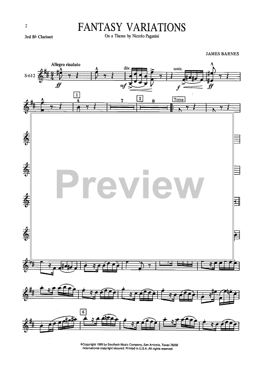 Digital Sheet Music for Fantasy Variations on a Theme of Paganini - Bb Clarinet 3 by James Barnes scored for Concert Band; id:503459