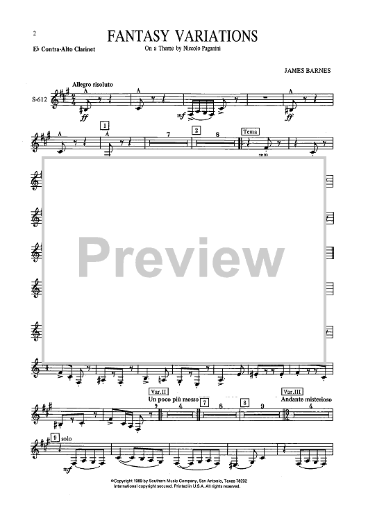 Digital Sheet Music for Fantasy Variations on a Theme of Paganini - Eb Contra Alto Clarinet by James Barnes scored for Concert Band; id:503461
