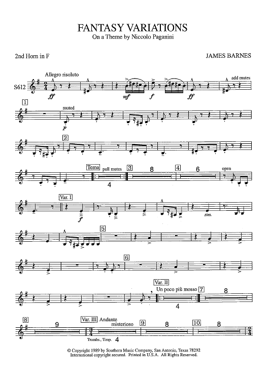 Digital Sheet Music for Fantasy Variations on a Theme of Paganini - F Horn 2 by James Barnes scored for Concert Band; id:503471