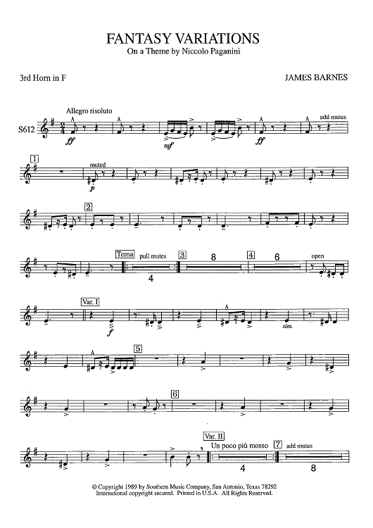 Digital Sheet Music for Fantasy Variations on a Theme of Paganini - F Horn 3 by James Barnes scored for Concert Band; id:503472