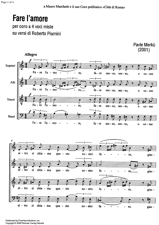 Digital Sheet Music for Fare l'amore (Making love) - Score by , Pavle Merkù scored for SATB Choir; id:351273