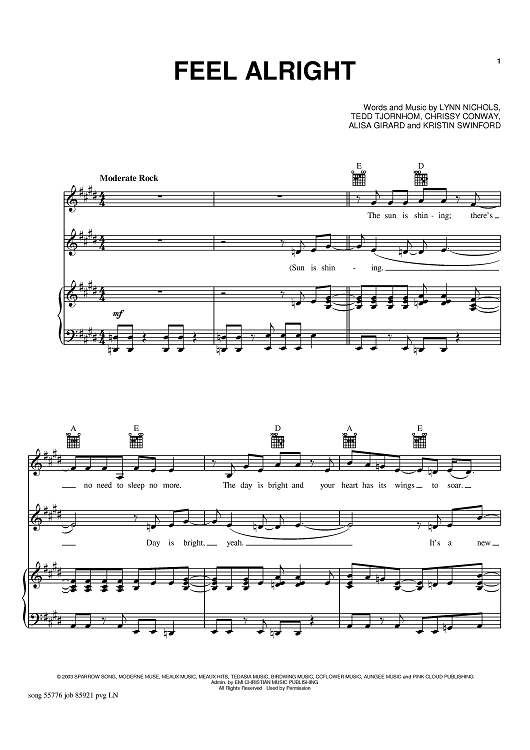 Digital Sheet Music for Feel Alright by Tedd T, Chrissy Conway, Lynn Nichols, ZOEgirl scored for Piano/Vocal/Chords; id:373159