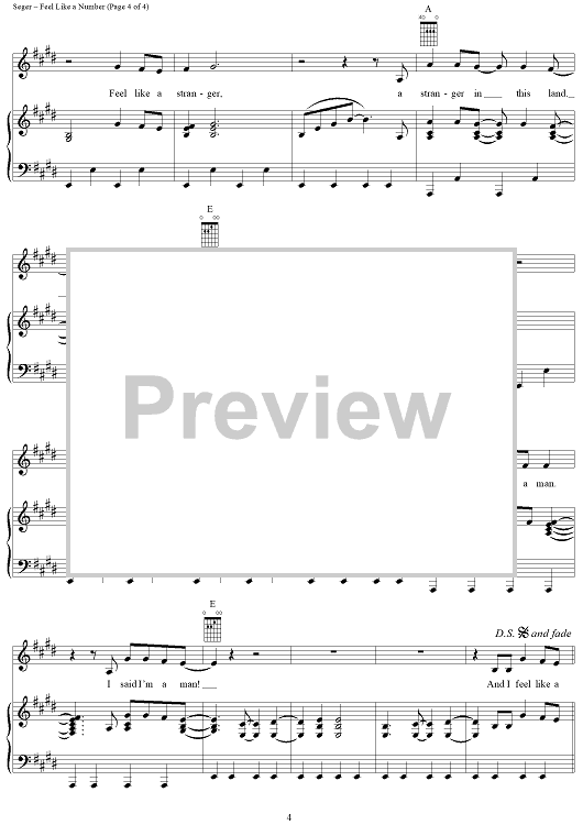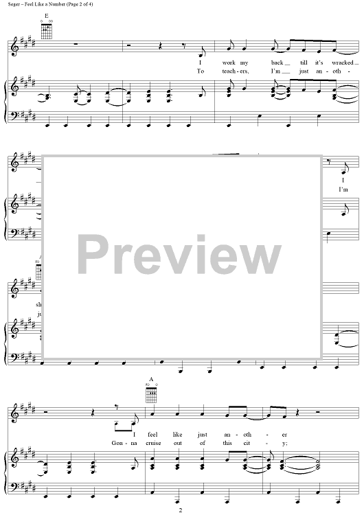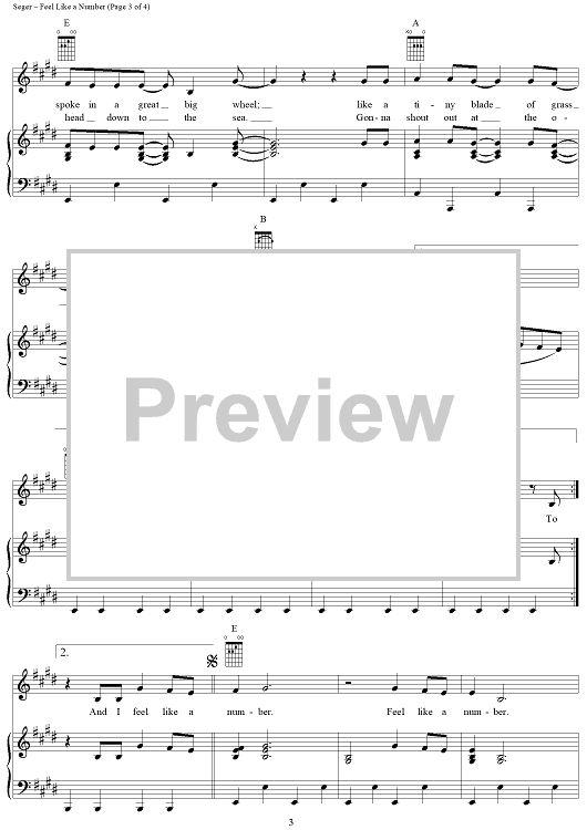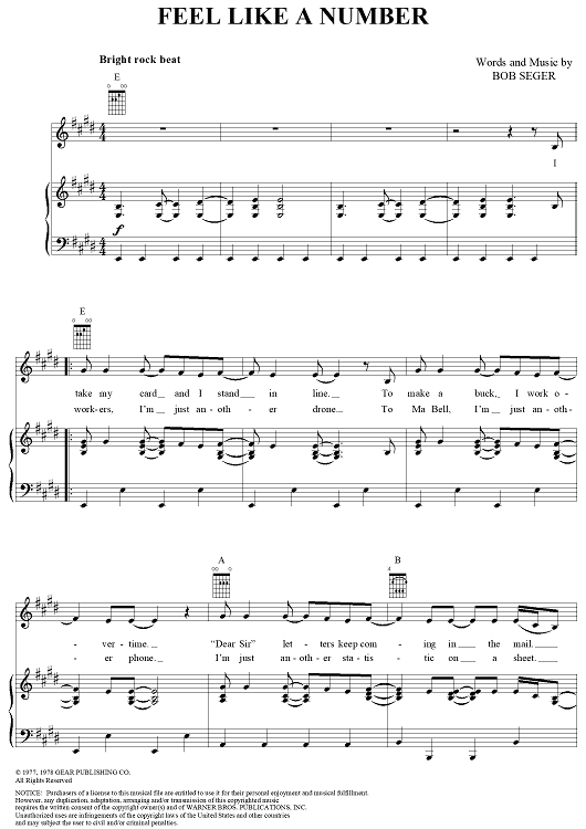 Digital Sheet Music for Feel Like a Number by Bob Seger, Silver Bullet Band scored for Piano/Vocal/Chords; id:240658