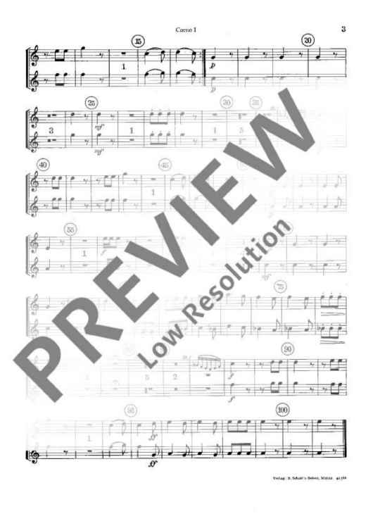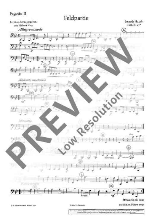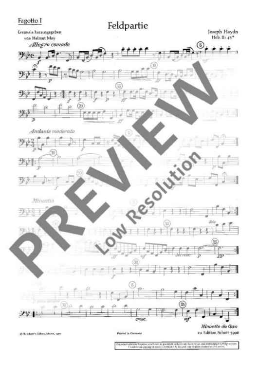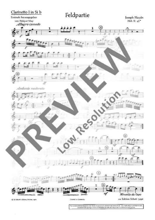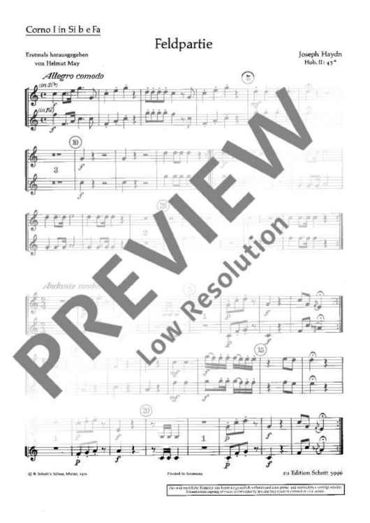 This work probably intended for the „Feldharmonie“ (military wind band) of Prince Esterhàzy has been scored for oboes, horns, clarinets and bassoons. In this edition, a piano score has been added to the score as a helpful means for studying and rehearsing. The individual horn parts are included both in the original version in Bb and in a simplified version in F. For wind bands an entertaining study and performance piece in four movements which is not very difficult.