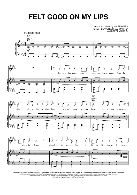 Digital Sheet Music for Felt Good On My Lips by Tim McGraw, Brad Warren, Brett Warren, Brett Beavers, Jim Beavers scored for Piano/Vocal/Chords; id:418728