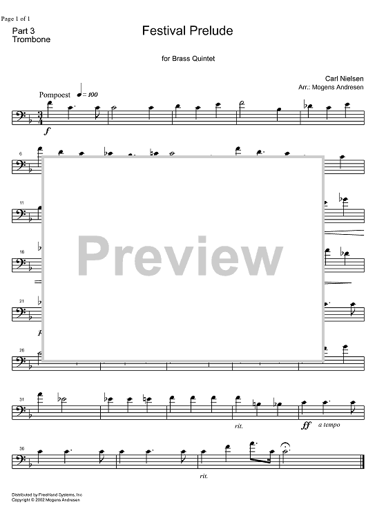 Digital Sheet Music for Festival Prelude - Trombone 1 by Mogens Andresen, Carl Nielsen scored for Brass Quintet; id:332021