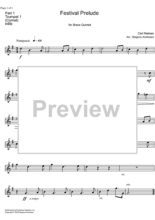 Digital Sheet Music for Festival Prelude - Trumpet 1 by Mogens Andresen, Carl Nielsen scored for Brass Quintet; id:332017