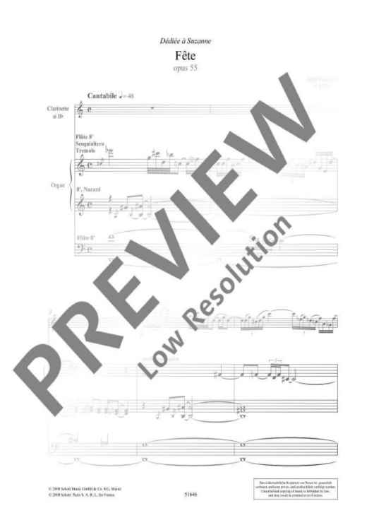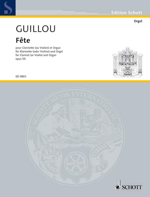 Jean Guillou, one of the most important organ composers of our time, studied with Marcel Dupré, Maurice Duruflé and Olivier Messiaen at the Paris Convervatoire. Following a several-year stay in Berlin (1958-63), he has been a titular organist at St. Eustache in Paris since 1963 and made appearances as a much sought-after concert organist and teacher of master classes. Written in 1955, the composition 'Fête' for clarinet and organ Op. 55 is a 20-minute virtuoso concertante piece which is aimed at professional players.