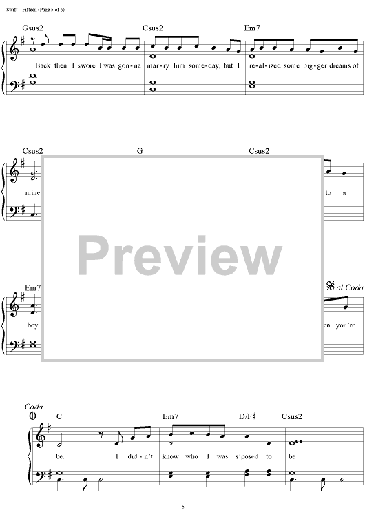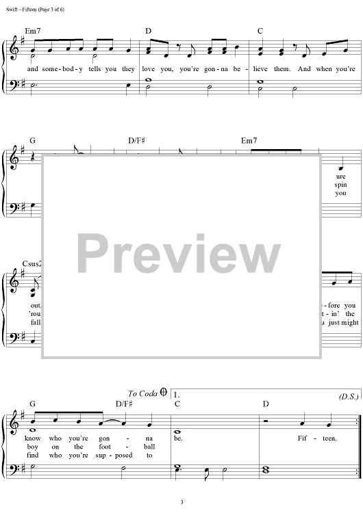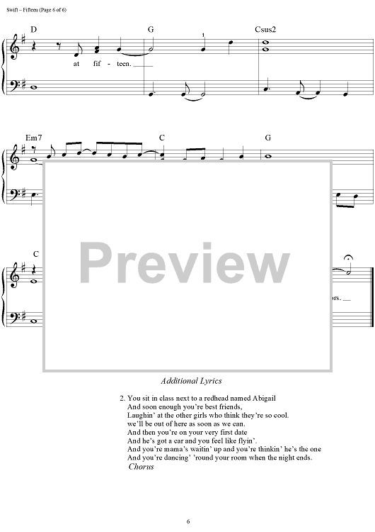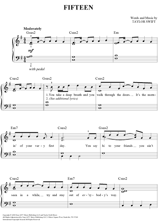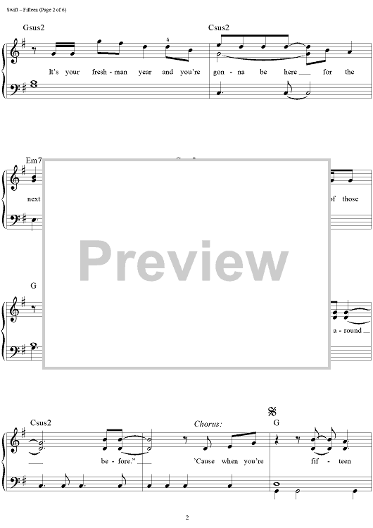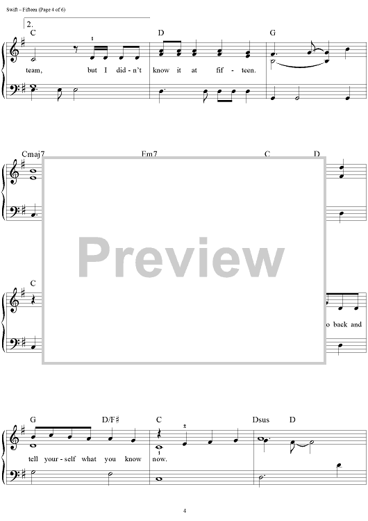 Digital Sheet Music for Fifteen by Taylor Swift scored for Easy Piano/Vocal/Chords; id:457534