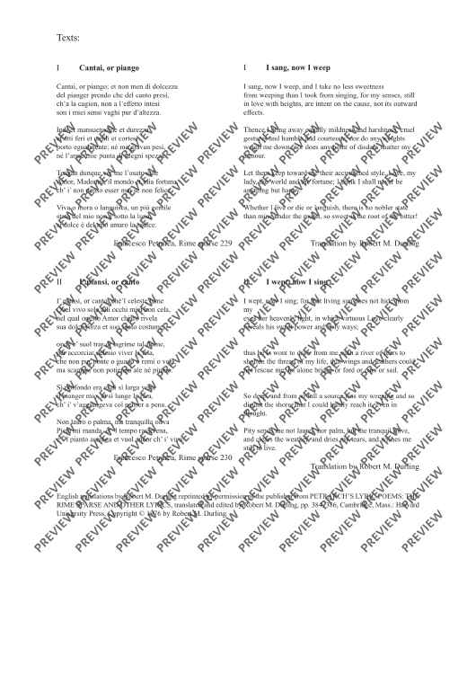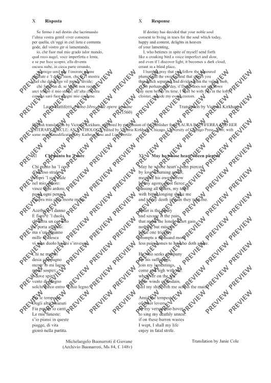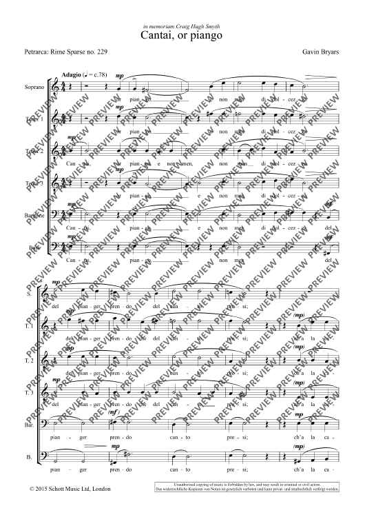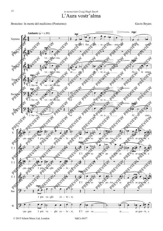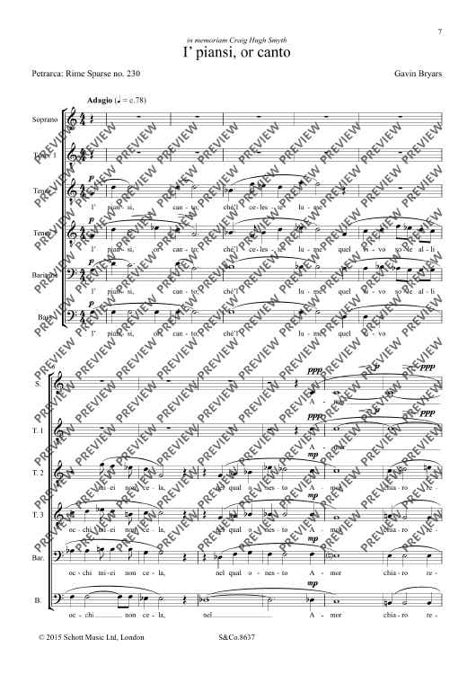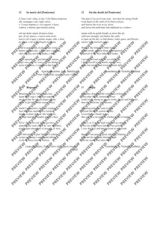 The choice of 16th century texts, by Bronzino and Battiferri, reflects the interests of the dedicatee of these sonnets - Craig Hugh Smyth, a fine art historian and former director of the Villa I Tatti, who was a specialist in Bronzino and Pontormo. Bronzino's sonnet is a lament on the death of Pontormo, his teacher; Laura Battiferri's poem is a direct response to that of Bronzino. As I was also asked to set sonnets by Petrarca, I chose two of his closely linked sonnets, numbers 229 and 230 in the Rime Sparse. I had written a work for I Tatti some five years earlier setting Petrarca ("A qualunque animale", the first in my Fourth Book of Madrigals) and was familiar with the context. However, through correspondence with Kathryn Bosi, Music Librarian at I Tatti and, through her, Craig Smyth's family, I became increasingly aware of his unusual and quite special character. From his undergraduate days at Princeton and indeed throughout his life, although a great scholar and writer, he was at the same time an aficionado of jazz, loving above all Louis Armstrong, being photographed with Duke Ellington, taking his children to see Thelonious Monk, listening to Ben Webster and playing the tenor saxophone himself. Indeed, he had told Kathryn Bosi that he had been proud to walk in procession at the funerals of black musicians in New Orleans. In some ways his life was almost an obverse mirror image of parts of my own - I was a professional jazz musician but found myself teaching art history for a time. As Fiorella Superbi of I Tatti has said: Craig was a maestro di vita. I raise a glass in his memory and dedicate these sonnets to him. Gavin Bryars