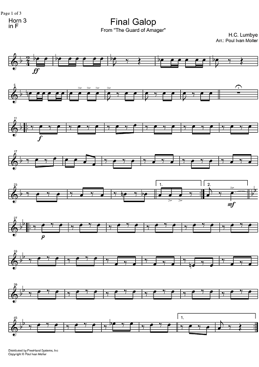 Digital Sheet Music for Final Galop from the Guard of Amager - Horn in F 3 by Hans Lumbye, Poul Ivan Moller scored for Concert Band; id:326737