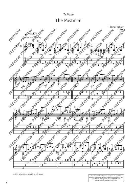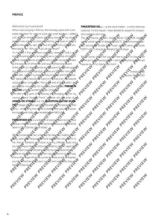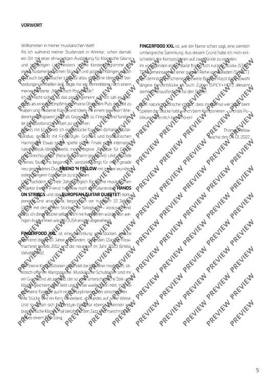Thomas Fellow, author of the successful standard work Fellow Guitar Book and a famous concert guitarist who performs all over the world (European Guitar Quartet, Friend `n Fellow, Hands on Strings), expands his Guitar Music Collection with this and the following volume 2 with an extensive amount of compositions in his own modern, stylistically open sound language. This book of 18 DELIGHTFUL CROSSOVER PIECES is aimed at interested students, concert guitarists as well as ambitious amateurs. The pieces are demanding (difficulty level 4 ) and, thanks to the additional notation in TABS, are a perfect addition to the repertoire of modern guitar literature, even for players who cannot read sheet music. FINGERFOOD XXL Vol. 1 includes shorter compositions (STARTER) and a whole series of ballads (SWEET). All pieces are concertante, but each in its own way. And so fingerstyle influences can be recognised as well as Brazilian sounds, sometimes Fellow approaches jazz, sometimes pop music and always conveys joy of playing and listening pleasure.