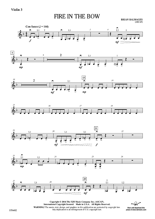 "Fire in the Bow - Violin 3" Sheet Music by Brian Balmages