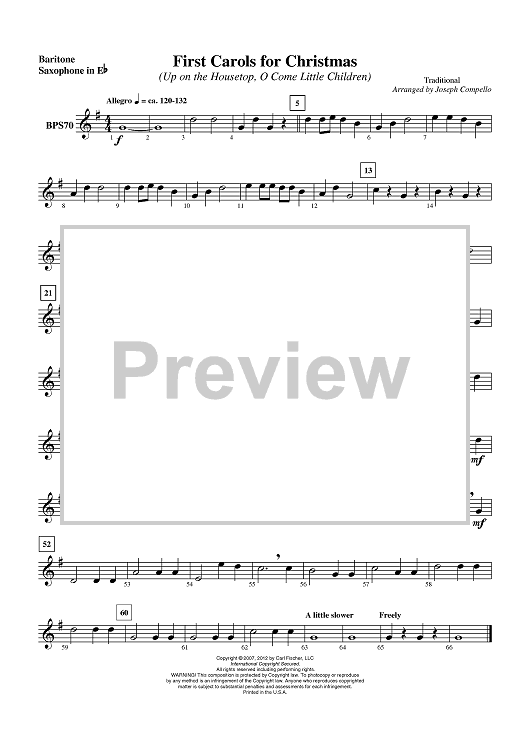 Digital Sheet Music for First Carols for Christmas - Baritone Sax by Traditional, Joseph Compello scored for Concert Band; id:430375