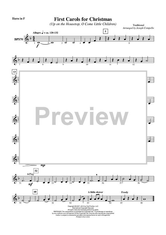 Digital Sheet Music for First Carols for Christmas - Horn in F by Traditional, Joseph Compello scored for Concert Band; id:430377