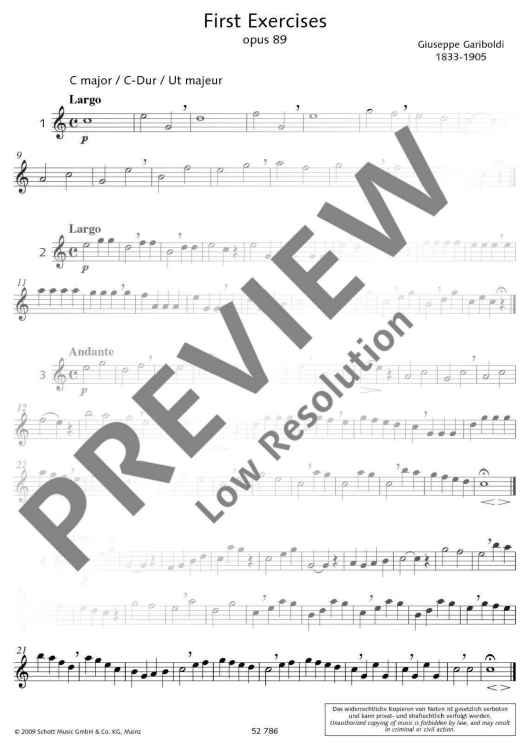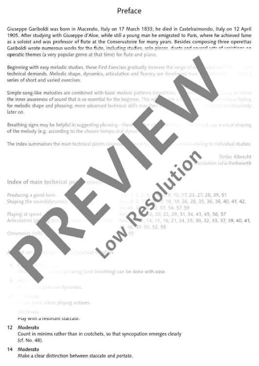 The Italian flute virtuoso Giuseppe Gariboldi (1833-1905) wrote numerous studies for the flute which are among today's standard teaching literature. Starting with easy melodic tonal studies, the 'First Exercises' gradually expand their range of tones, thus increasing the technical demands. Melodic and harmonic progression, dynamics, articulation and dexterity are developed in short, exercises arranged in varying ways, starting from the basics. The song-like, easily comprehensible melody in connection with elementary motivic work (repetitions of motifs, sequences and variations) trains the inner tonal image which is imperative for the beginner in particular. When a sense of melodic progression and phrasing is developed on this basis, the increasing technical elements added later are incorporated both unobtrusively and organically. This new volume in the well-known Schott series 'Essential Exercises' is complemented by teaching tips and an index of the technical and musical topics.