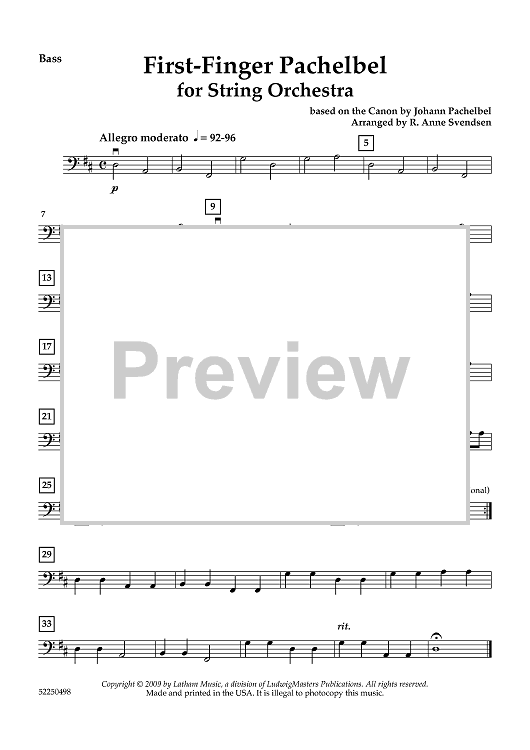 Digital Sheet Music for First-Finger Pachelbel - Double Bass by Johann Pachelbel, R. Anne Svendsen scored for String Orchestra; id:459841