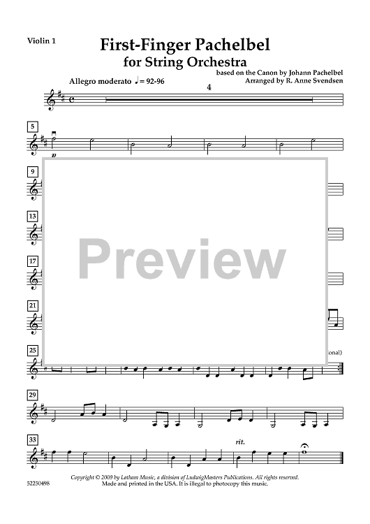 Digital Sheet Music for First-Finger Pachelbel - Violin 1 by Johann Pachelbel, R. Anne Svendsen scored for String Orchestra; id:459837
