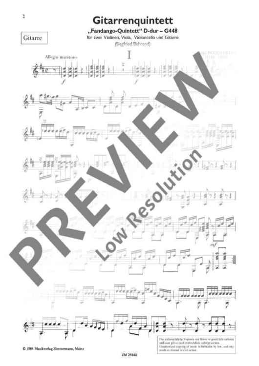 Für Luigi Boccherinis (1743-1805) alljährlich dem preußischen Hof zugedachten Quintettkompositionen erhielt er von König Friedrich Wilhelm II. den Titel und die Besoldung eines Hofkomponisten. Er konnte sich aber nicht entschließen, sein sonniges Madrid mit dem preußisch-strengen Berlin zu vertauschen. Das Fandango-Quintett wurde in dieser Ausgabe für den praktischen Gebrauch von Siegfried Behrend bearbeitet. Es enstpricht dem Quintett No. 4 (G 448).