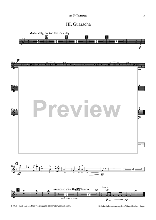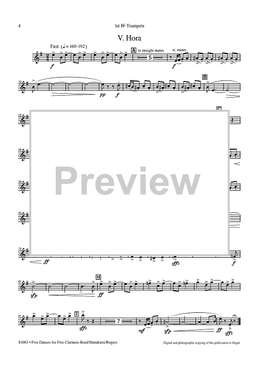 Digital Sheet Music for Five Dances for Five Clarinets - 1st Bb Trumpets by Alfred Reed, R. Mark Rogers, Yasuhiro Murakami scored for Concert Band; id:507231