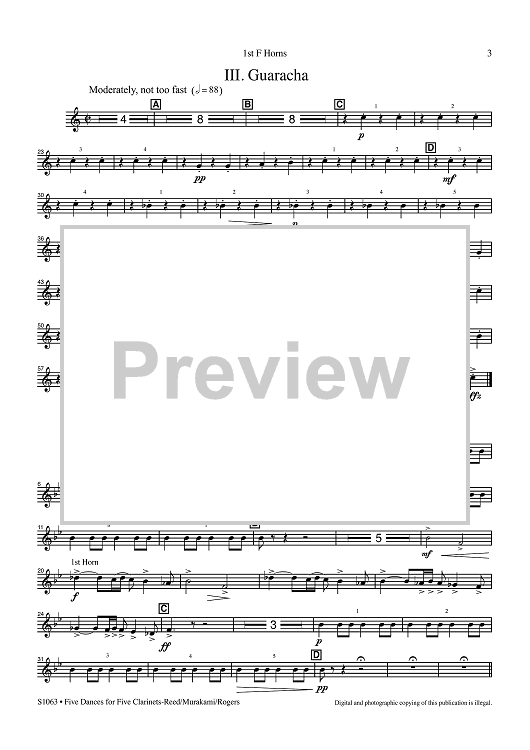 Digital Sheet Music for Five Dances for Five Clarinets - 1st F Horns by Alfred Reed, R. Mark Rogers, Yasuhiro Murakami scored for Concert Band; id:507234