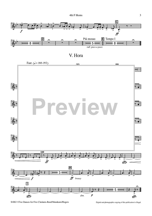 Digital Sheet Music for Five Dances for Five Clarinets - 4th F Horns by Alfred Reed, R. Mark Rogers, Yasuhiro Murakami scored for Concert Band; id:507237