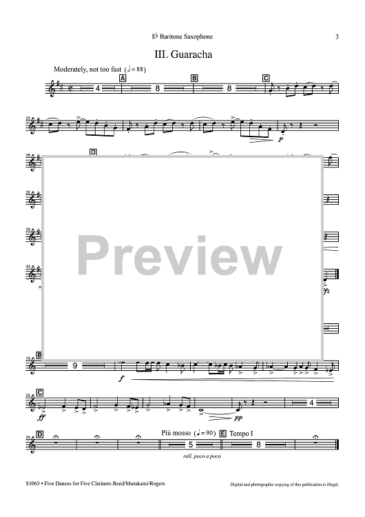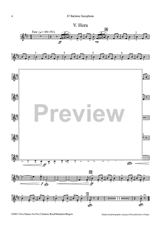 Digital Sheet Music for Five Dances for Five Clarinets - Eb Baritone Saxophone by Alfred Reed, R. Mark Rogers, Yasuhiro Murakami scored for Concert Band; id:507229