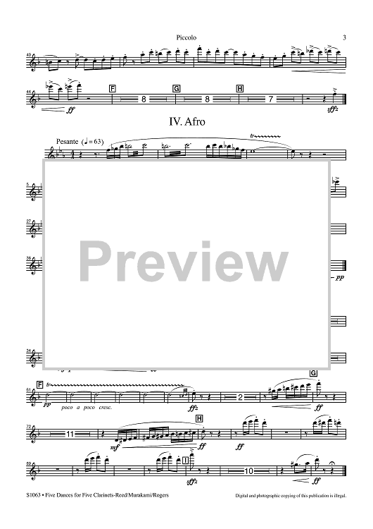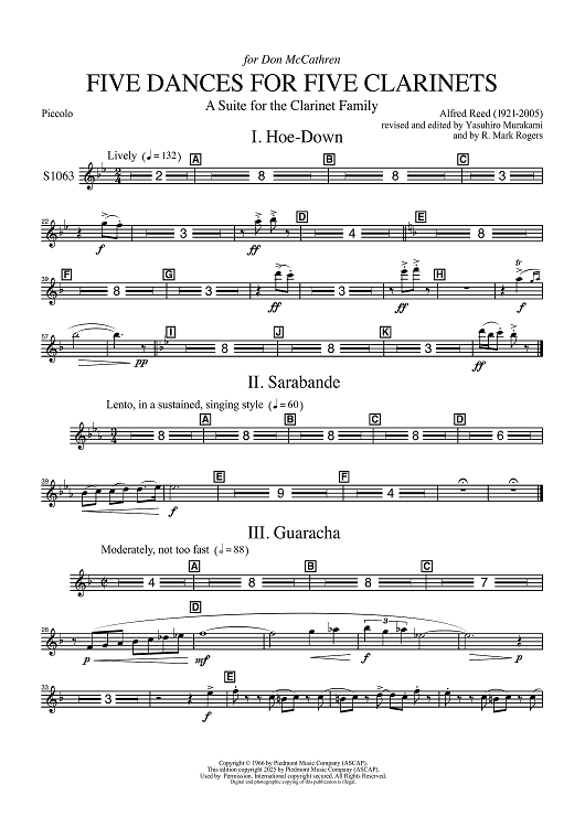 Digital Sheet Music for Five Dances for Five Clarinets - Piccolo by Alfred Reed, R. Mark Rogers, Yasuhiro Murakami scored for Concert Band; id:507211