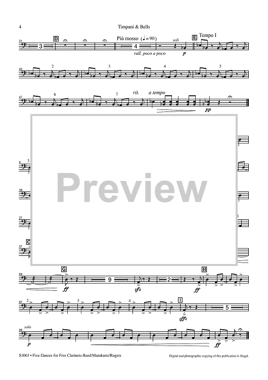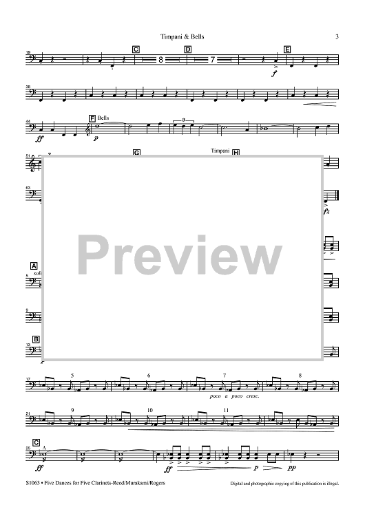 Digital Sheet Music for Five Dances for Five Clarinets - Timpani / Bells by Alfred Reed, R. Mark Rogers, Yasuhiro Murakami scored for Concert Band; id:507244