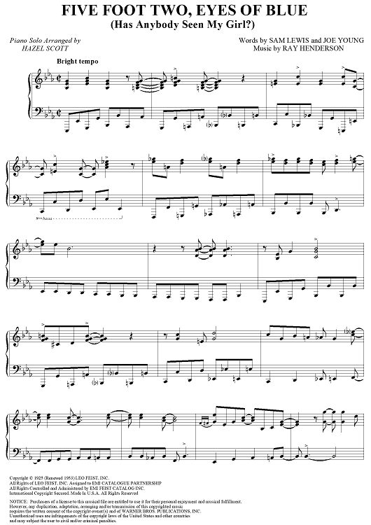 Digital Sheet Music for Five Foot Two, Eyes of Blue (Has Anybody Seen My Girl?) by Ray Henderson, Hazel Scott, Samuel M. Lewis, Joseph Young scored for Piano Solo; id:116488