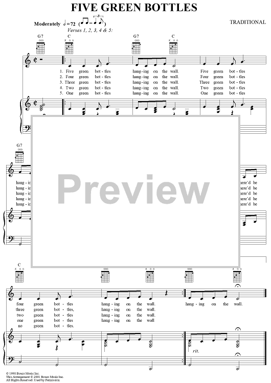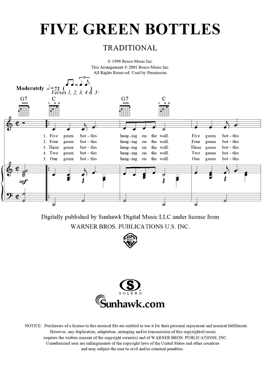 Digital Sheet Music for Five Green Bottles by Traditional scored for Piano/Vocal/Chords; id:289006