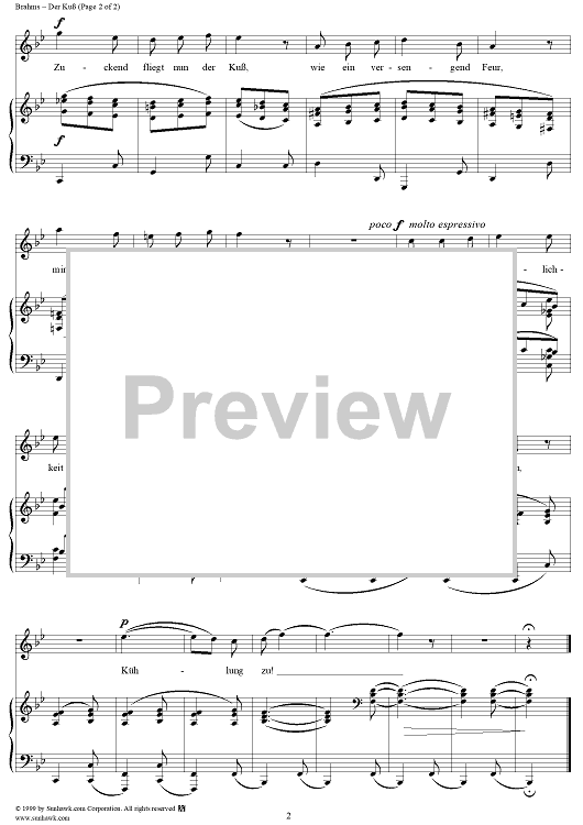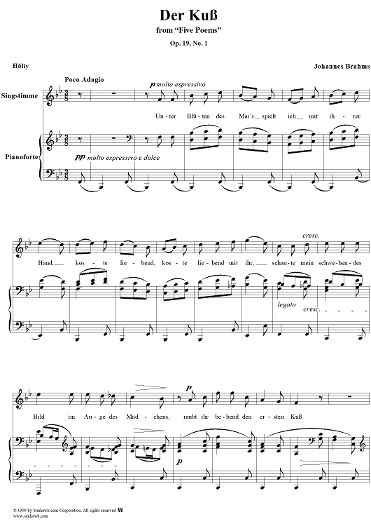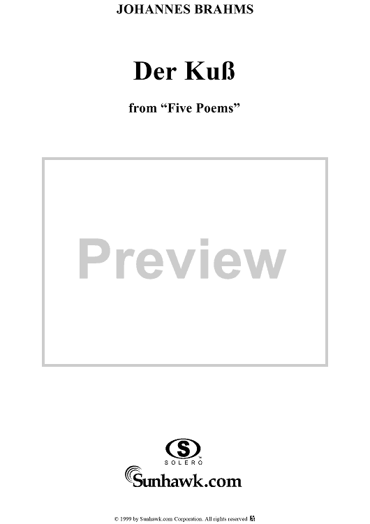 Digital Sheet Music for Five Poems, Op. 19, No. 1, Der Kuß by Johannes Brahms, Hölty scored for Voice/Piano; id:274116