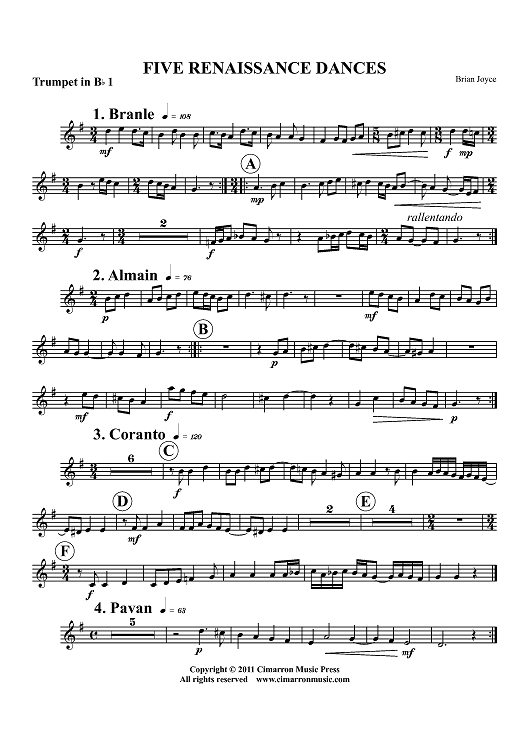 "Five Renaissance Dances - Trumpet 1 in Bb" Sheet Music by Brian Joyce
