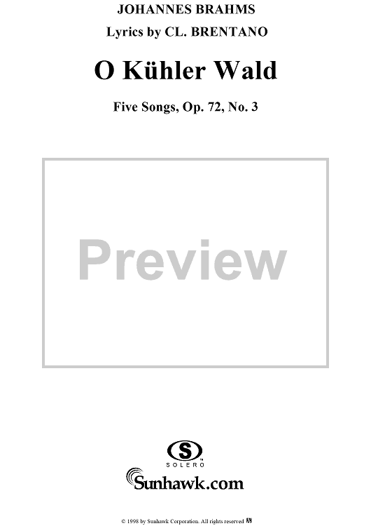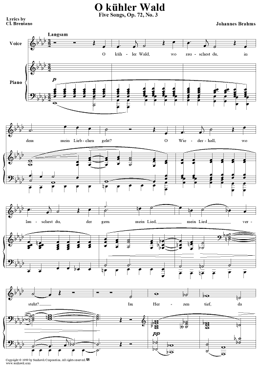 Digital Sheet Music for Five Songs, No. 3: O Kühler Wald by Johannes Brahms, Clemens Brentano scored for Voice/Piano; id:118498