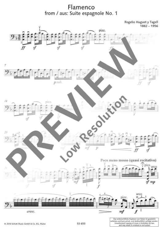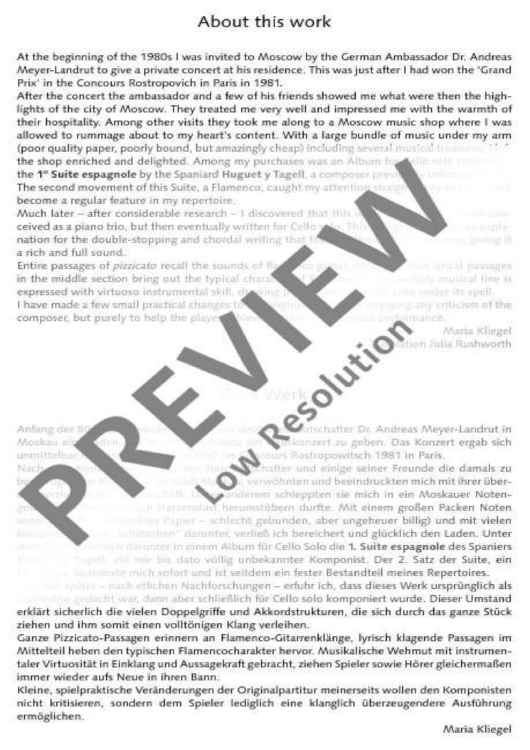 The combination of musical melancholy and instrumental virtuosity captivates both players and audience alike. 'Flamenco' comes from the Suite espagnole No. 1 by the rather unknown Spanish composer Rogelio Huguet y Tagell. Originally intended as a piano trio, the suite was eventually composed for violoncello solo. This fact certainly explains the numerous double stops and chord structures running through the entire piece, thus giving it a sonorous sound. Entire pizzicato passages are reminiscent of flamenco guitar sounds and lyrically lamenting passages in the middle section emphasize the typical flamenco character.