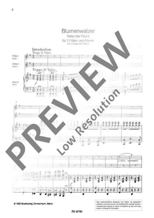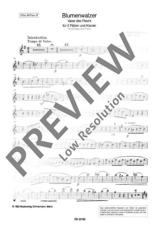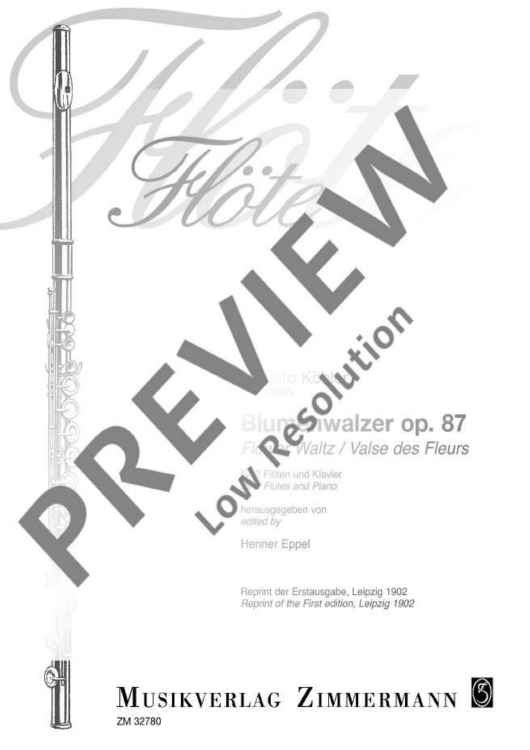 In 1876, Julius Zimmermann (1851-1923) established a music publishing company in St. Petersburg. He entertained friendly relations with Ernesto Köhler as well as with other musicians, and printed a great number of Köhler's more than 100 flute compositions. Most of the compositions are romantic salon pieces with imaginative names, written for flute and piano, including highly virtuoso works but also compositions for technically less skilled flute amateurs. The Blumenwalzer op. 87 (flower waltz) - one of the few Köhler pieces for 2 flutes and piano - is less difficult as regards fingering. Young flutists with a beautiful tone can use it to sense the fine melodies of this charming and entertaining kind of music.