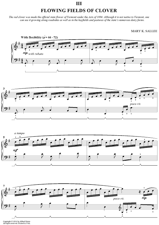 Colorful scenes from Vermont are depicted throughout this suite. The Hike to Killington Peak uses syncopation and a swing feel to musically recreate a mountain hike. A grandiose middle section represents the summit. In Farewell to Fall, vibrant colors fade to winter, portrayed by a minor tonality, flowing bass line, and lyrical melody. The state flower is heralded in Flowing Fields of Clover with running sixteenth notes and a syncopated bass. Vermont Maple Syrup pays tribute to the sweet sap that flows in the spring. Written in bluegrass style, one can almost hear the banjo playing at harvest time. "Farewell to Fall" is a Federation Festivals 2016-2020 selection.