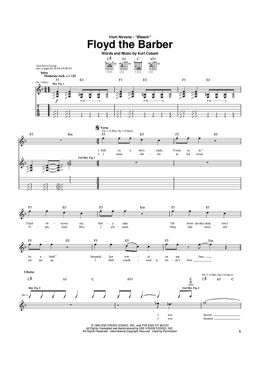 Digital Sheet Music for Floyd The Barber by Kurt Cobain, Nirvana scored for Guitar Tab; id:372455