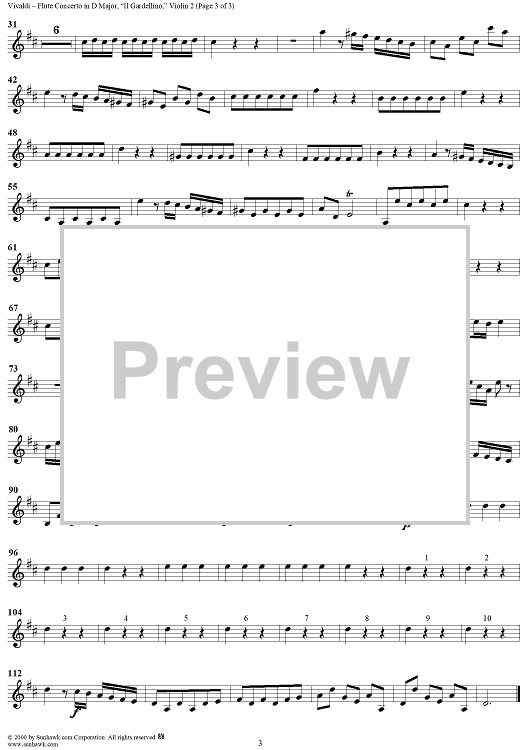 Digital Sheet Music for Flute Concerto in D Major ("Il Gardellino"), op. 10, no. 3 - Violin 2 by Antonio Vivaldi scored for Flute/Strings/Continuo; id:235543