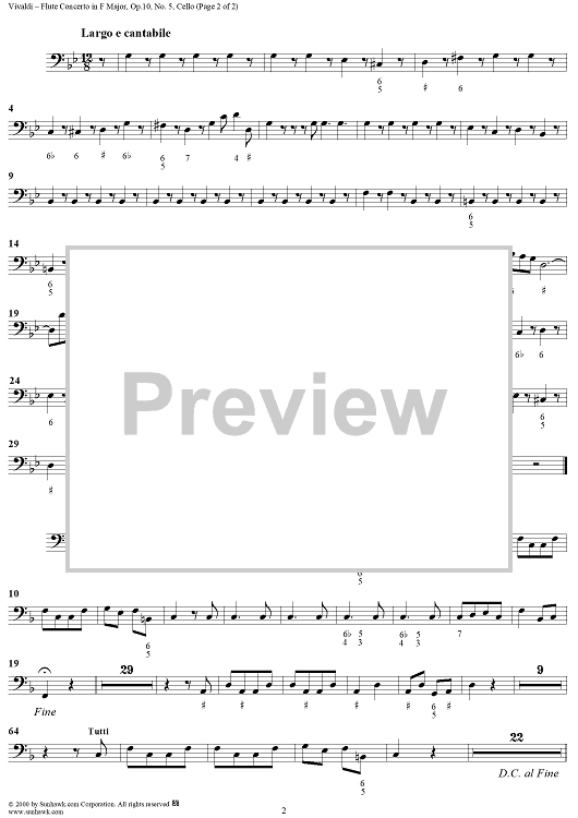 "Flute Concerto in F Major, Op. 10, No. 5 - Cello" Sheet Music by Antonio Vivaldi