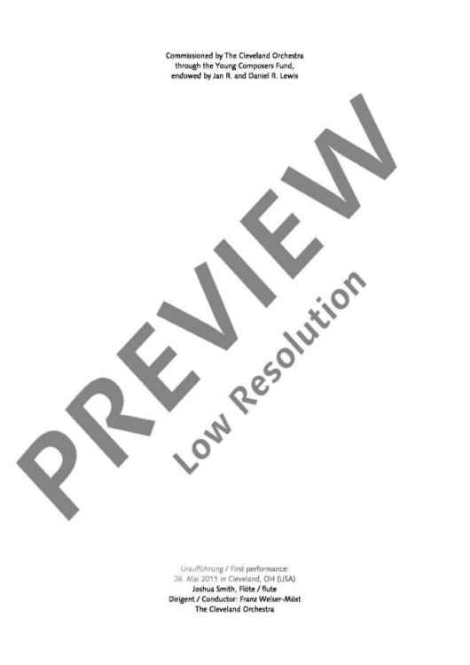 This ‚Suite’ is not one of my ‘epic’ instrumental concertos such as the concertos for cello, violin or oboe, but a substantially smaller-structured series of dance forms arranged into a suite. Sunken worlds suddenly emerge here, only to reach the surface, hover in dangerously distorted fashion and then sink back to the bottom. Almost every individual movement allots the solo flute a specific tonal colouring and an instrumental group from the orchestra: in the opening Allemande, the flutes of the orchestra (including alto and bass flute and later also piccolo to include the entire flute family); the string section in the Sarabande; in both chorales (extremely muted in the first and brutalist in the second), the brass etc.; and it is only in the concluding Badinerie that all orchestral groups are combined, although they are terraced in the Baroque style, one following another, seldom all playing simultaneously. This permits the flute to remain the provider of all impulses; it attaches itself to the wide variety of instrumental colours, becomes suffused with these colours and thereby shines in different lights – acerbic, pale and radiant. This first performance marks the conclusion of my two-year residence with the Cleveland Orchestra. The immense versatility of this fine body of sound (which is indeed treated as such with the sum of its parts) and the exciting dark timbre of its principal flautist Joshua Smith have to a great extent determined the form and tonal character of my Flûte en suite. Jörg Widmann