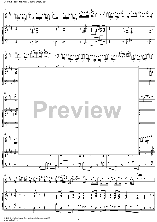 Digital Sheet Music for Flute Sonata in D Major, Op. 2, No. 5 - Piano Score by Pietro Antonio Locatelli scored for Flute/Piano/Cello; id:235961
