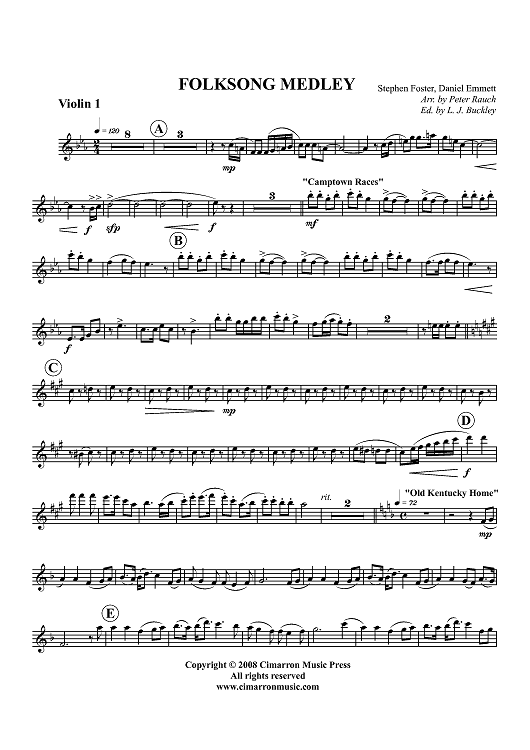 Digital Sheet Music for Folksong Medley - Violin 1 by Daniel Decatur Emmett, Peter Rauch, Stephen Foster, Lewis J. Buckley scored for String Quartet; id:416141